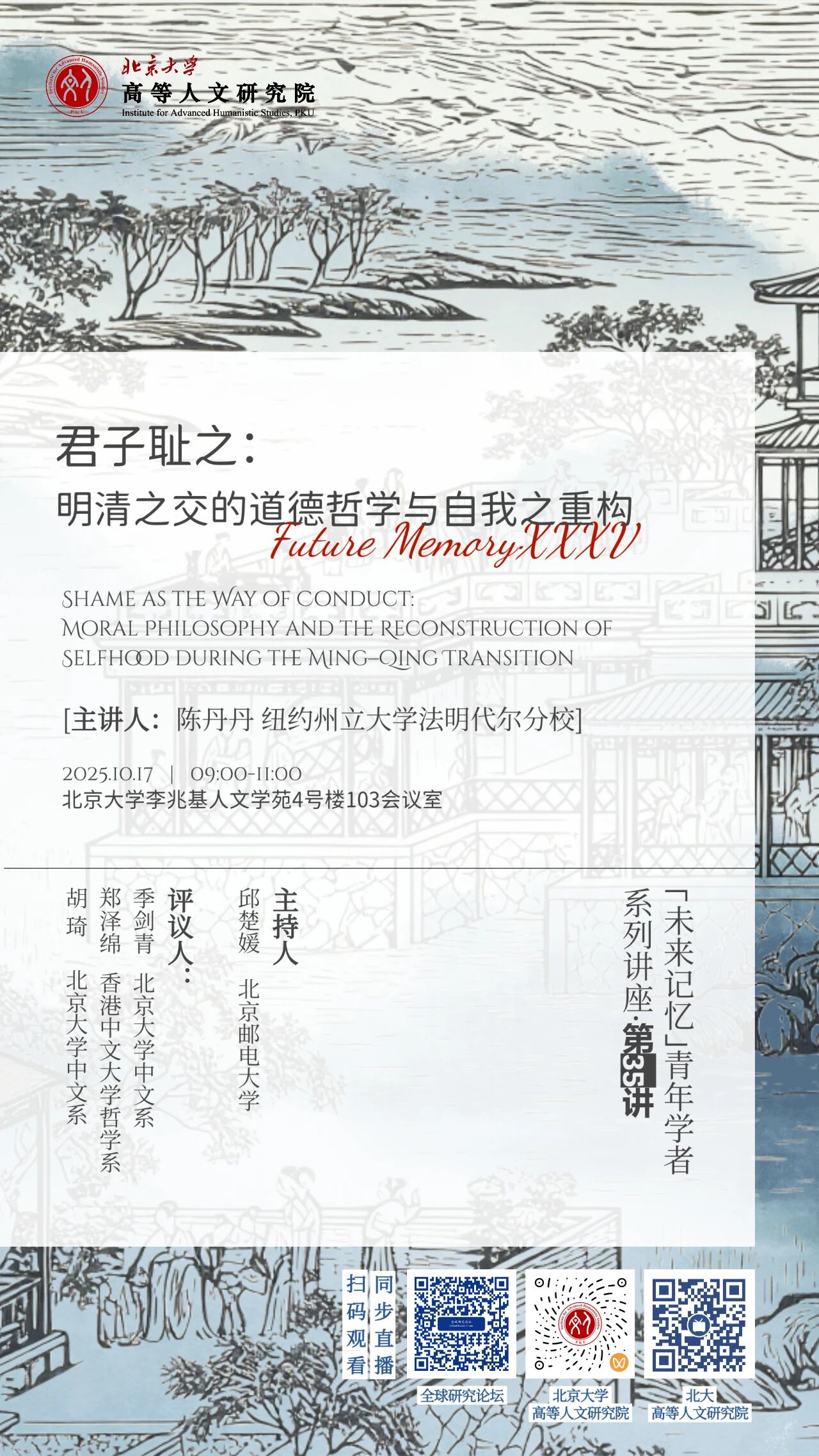 本讲座以“君子耻之”为要义,从思想史与文学的角度探讨明清之交士人如何借“论耻”重建道德秩序与自我意识。作为作者专著《明末清初和清末民初的文化世界:转折时代的文人与世变》的延伸,本讲座聚焦“耻”在道德行动与主体生成中的核心地位,探入明清之交道德哲学的重要面向。